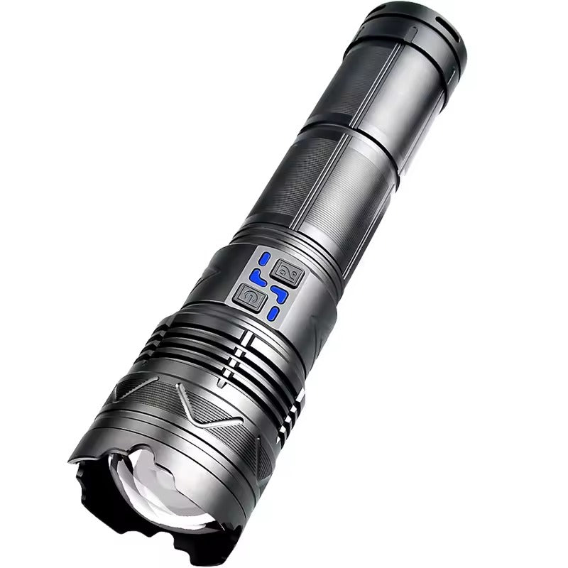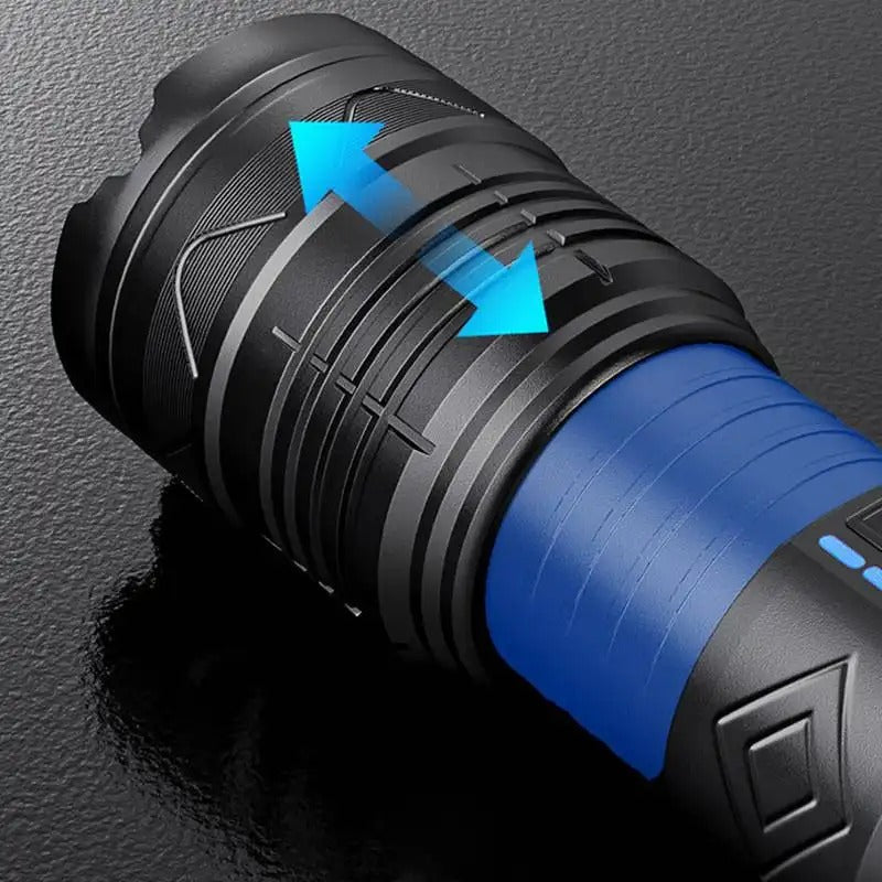 Featuring a zoomable pull/push head, the Tactical LED Flashlight with USB Charging lets you adjust the beam focus easily—from a wide floodlight to a narrow spotlight—perfect for any situation. Built from sturdy aluminium alloy, this 100W flashlight is both lightweight and durable, able to withstand rugged conditions.
