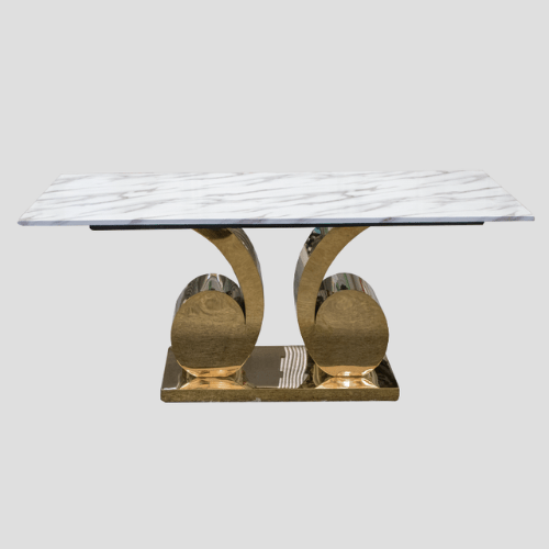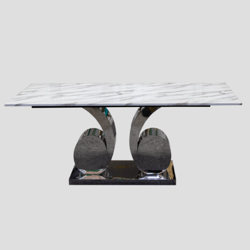 The PrimeNest - Aria Dining Table is a masterpiece of modern elegance, meticulously designed to elevate your dining space with a sophisticated and inviting presence. Featuring a stunning marble-finish tempered glass tabletop and a bold, curved chrome base, this statement piece seamlessly blends luxury with practicality. Whether hosting refined dinner parties, intimate meals, or family gatherings, the PrimeNest - Aria Dining Table enhances every occasion with a touch of contemporary sophistication.
